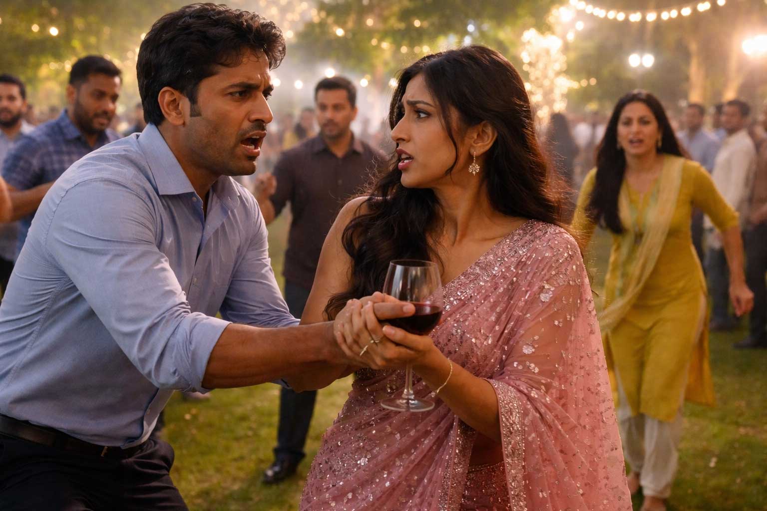 The lawn was full of sound of guffaws and arguments, but suddenly screams arose above this cacophony and stopped all conversations. Everyone turned to see. Ruchika was shocked. Neetan was pulling at Shubhangi who was struggling to get free of his hold. Ruchika rushed to the spot. Shubhangi had a glass of red wine in her hand. Neetan had clasped her hand strongly and was saying, "Charu, don't drink poison. They want to kill you. I won't let them do that."