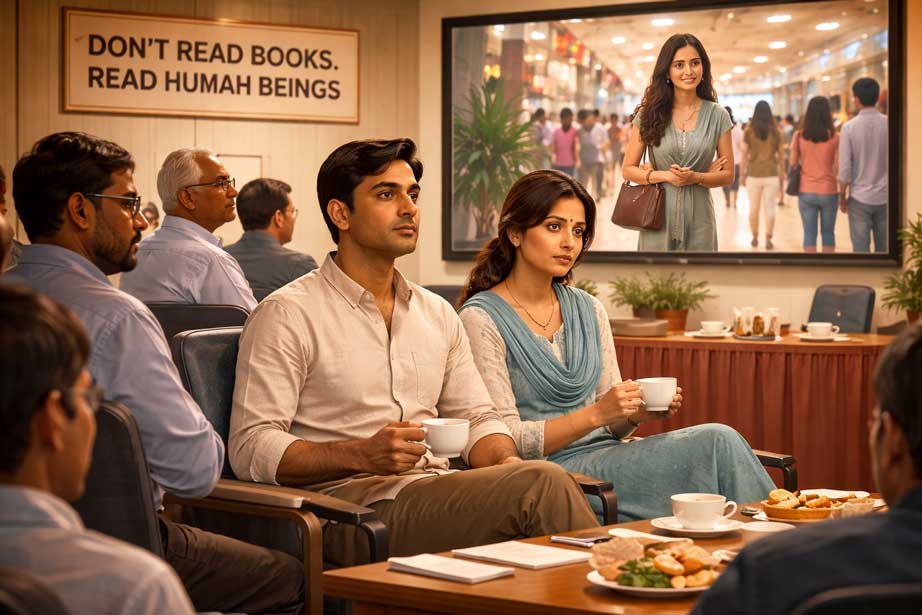 When they arrived at the Centre, Doctor Ram Prasad and his students were seated in the conference hall. The atmosphere was light—full of laughter, casual conversation, and friendly banter. On a large screen mounted on the wall, an English movie was playing.